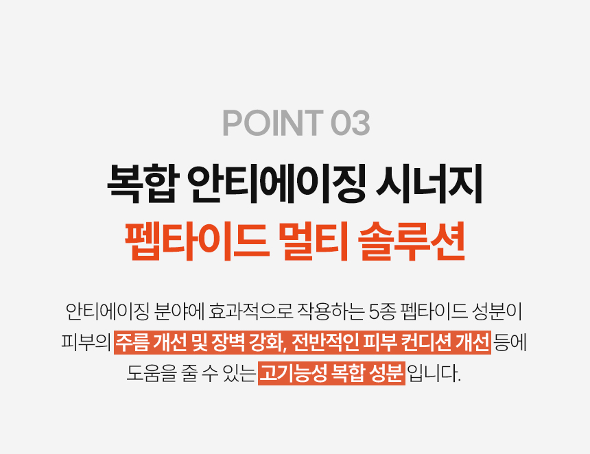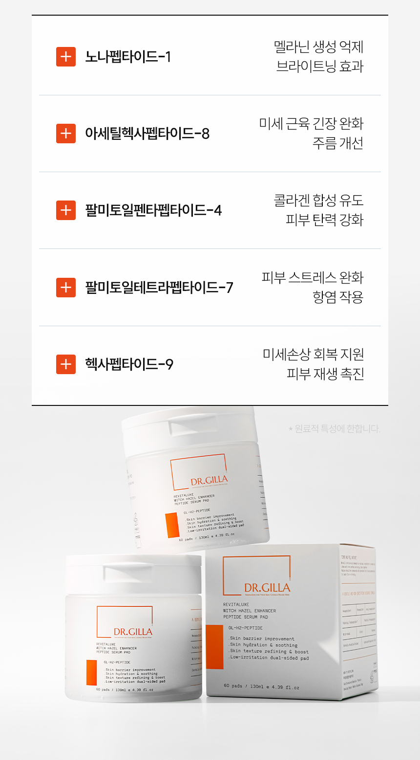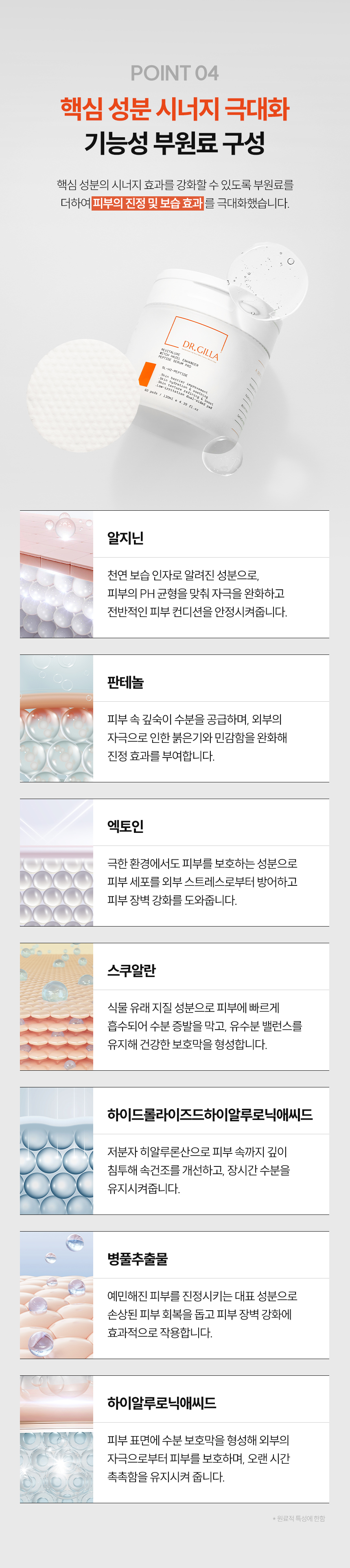 정제수, 버지니아풍년화수, 부틸렌글라이콜, 다이프로필렌글라이콜, 다이소듐이디티에이, 글리세레스-26, 메틸글루세스-20, 하이드록시아세토페논, 1,2-헥산다이올, 폴리글리세릴-10라우레이트, 폴리글리세릴-10미리스테이트, 글리세린, 알지닌, 잔탄검, 아크릴레이트/C10-30알킬아크릴레이트크로스폴리머, 카프릴릴글라이콜, 소듐하이알루로네이트, 에틸헥실글리세린, 판테놀, 엑토인, 스쿠알란, 하이드록시에틸우레아, 펜틸렌글라이콜, 은행나무잎추출물, 소엽잎추출물, 소목껍질추출물, 작약뿌리추출물, 녹차추출물, 소듐하이알루로네이트크로스폴리머, 하이드롤라이즈드하이알루로닉애씨드, 병풀추출물, 하이알루로닉애씨드, 트라이에탄올아민, 하이드롤라이즈드소듐하이알루로네이트, 노나펩타이드-1, 아세틸헥사펩타이드-8, 팔미토일펜타펩타이드-4, 팔미토일테트라펩타이드-7, 헥사펩타이드-9